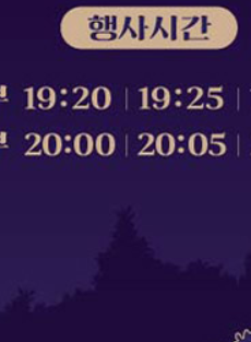 | 상반기 행사 | 2025년 4월 10일 ~ 6월 15일 | 매주 목~일 | 19:20 / 19:25 / 19:30 / 20:00 / 20:05 / 20:10 |